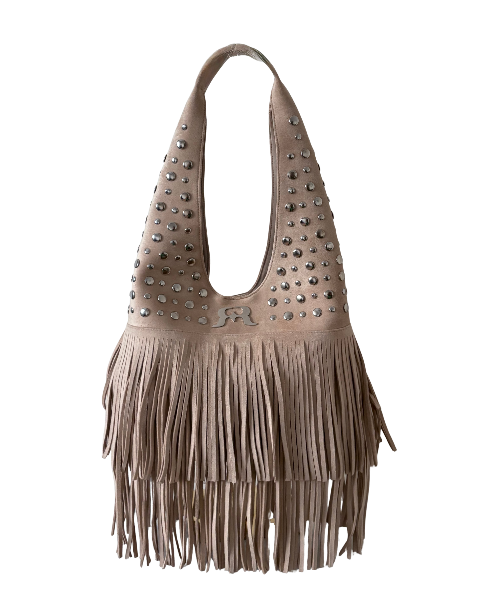 this suede shoulder bag is designed to elevate your everyday look with a statement edge. Crafted from soft, high-quality suede, it features striking metallic studs across the front for a touch of attitude, while fluid fringe detailing adds movement and a bohemian-western flair.